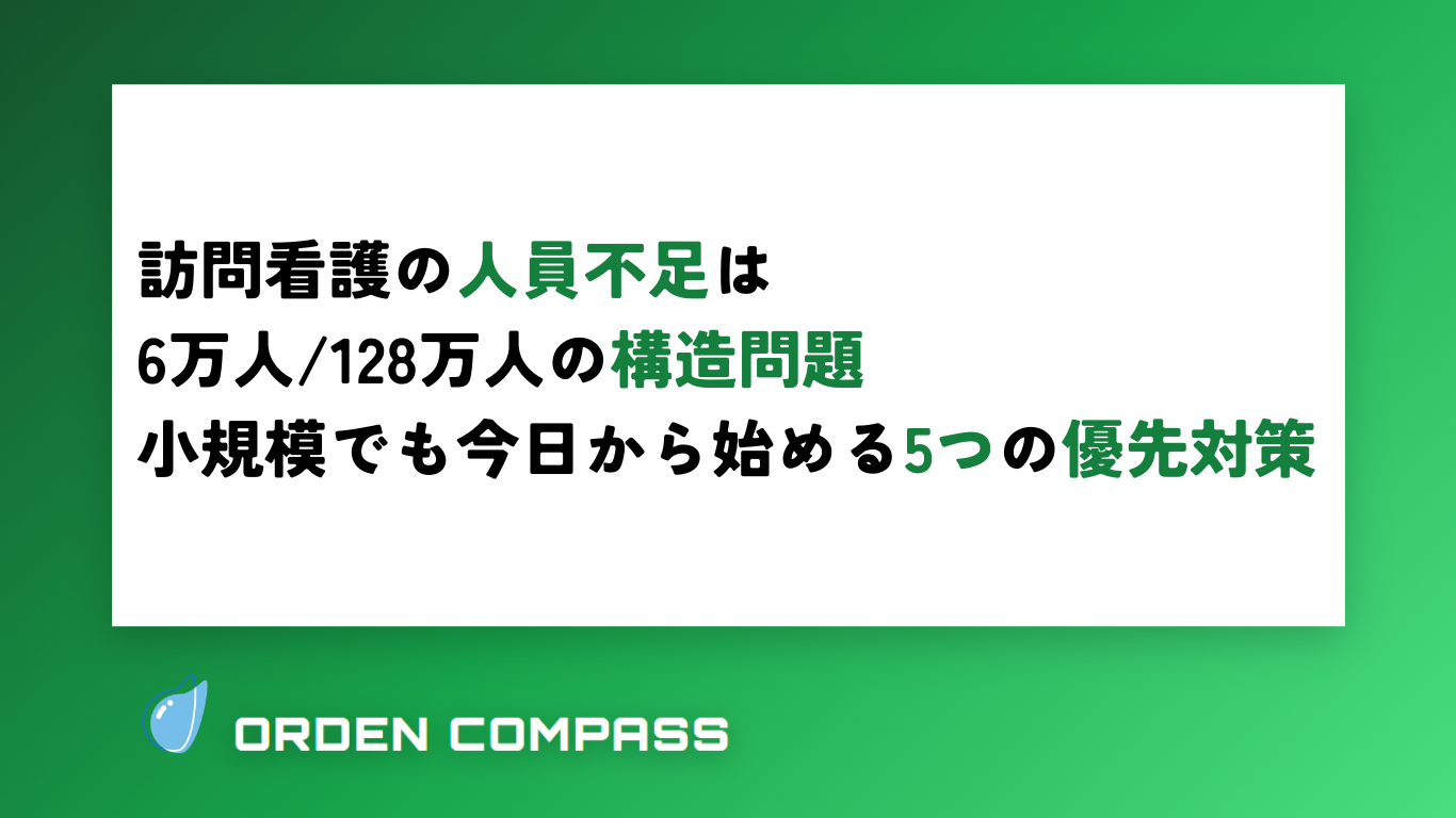 訪問看護の人員不足は、看護師128万人のうち訪問看護従事者が6万人(4.6%)しかいない構造的な問題です。需要は10年で3倍に増加し、2025年までに13万人が必要ですが、現状は目標の半分以下です。