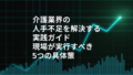 介護現場の課題は、人材不足・業務過多・対応の複雑化・連携不足という4つの構造的問題です。解決には、現状可視化→優先順位決定→小改善→仕組み導入→効果測定という5ステップを着実に進めることが重要です。