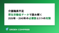 A:2025年に約32万人、2040年には約69万人の介護職員が不足すると予測されています。毎年約5万人ずつの人材確保が必要です。